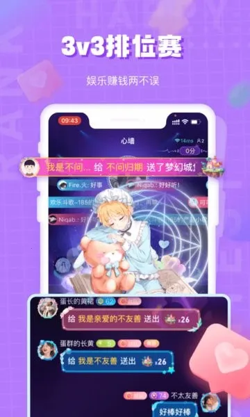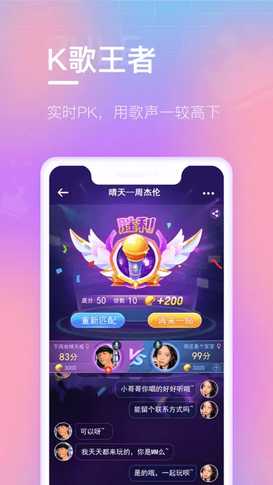2. 支持多种竞技模式,如1V1排位赛、3V3战队竞技等,1V1演唱PK,实时AR评分,凭唱歌实力提升段位等级,问鼎歌王称号。