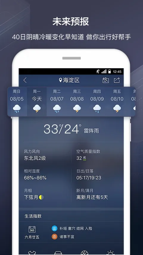 1. 依托权威数据授权预报,采用先进互联网播报技术,能为用户实时提供全国各地的实时天气预告、24小时预报、15天预报、空气质量指数等其他预报信息,带来最准确的未来天气预报。