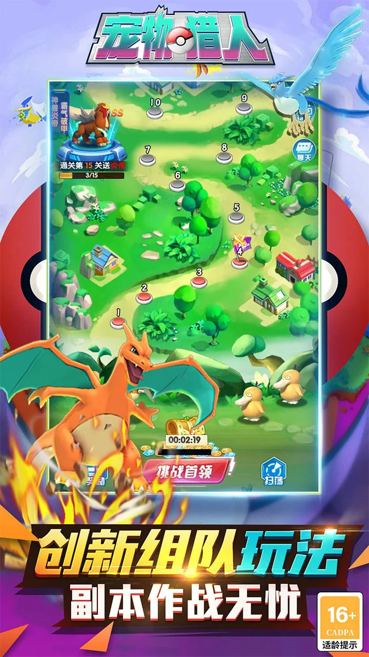 3. 多种精灵竞技场,像天王争霸等,能击败强敌赢取冠军天王。派出宠物小队开启冒险,体验策略战斗的魅力。