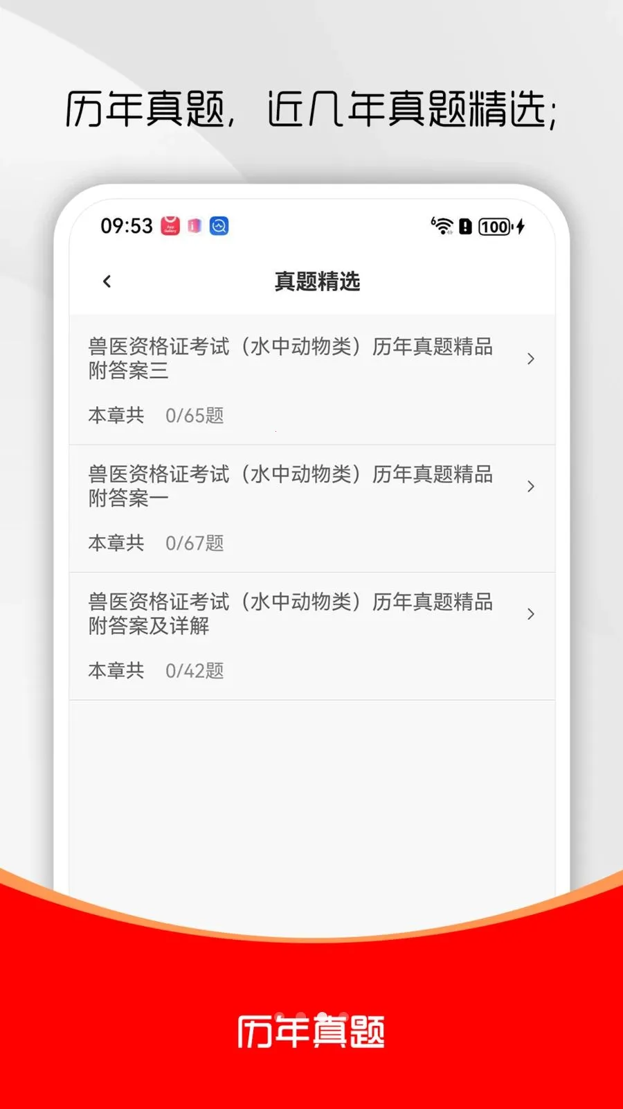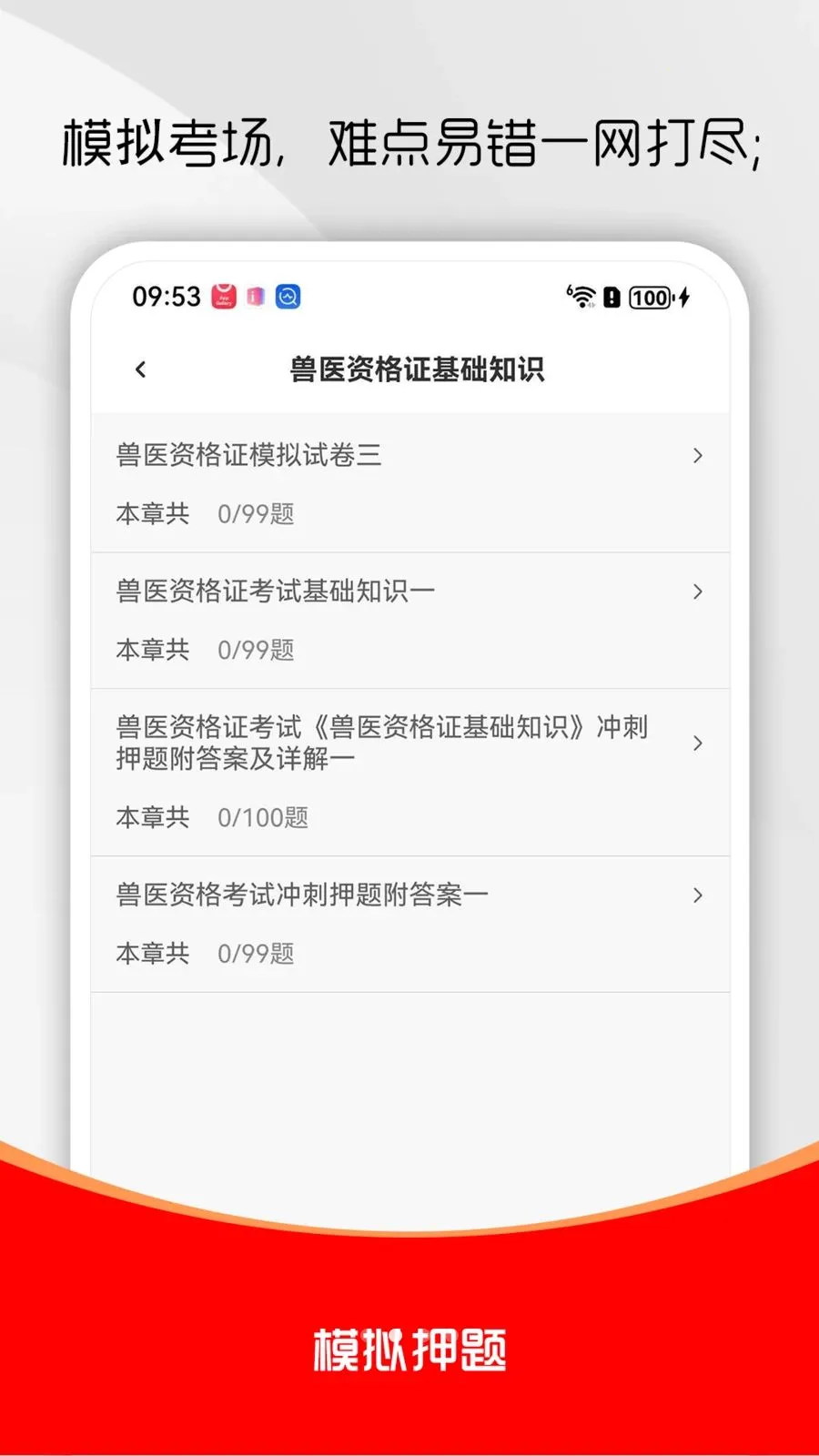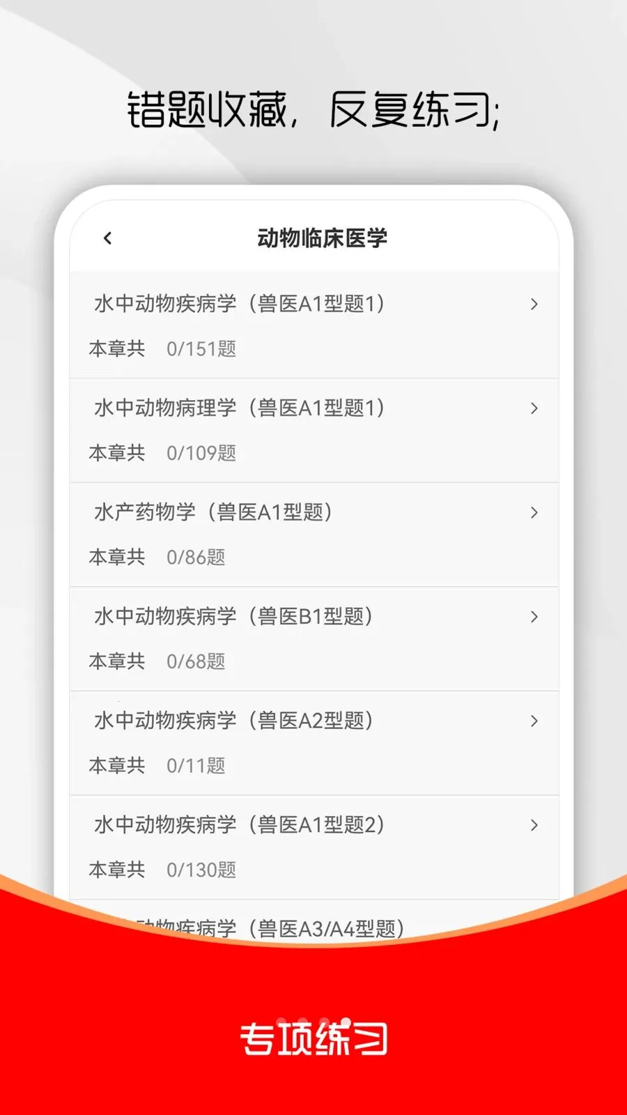 执业兽医考试题库软件有最新考试题库,含答案解析,涵盖历年真题、章节练习、模拟押题等。能专项练习,模拟考场,查漏补缺,错题可收藏,真题押题更新,助你顺利通过考试。