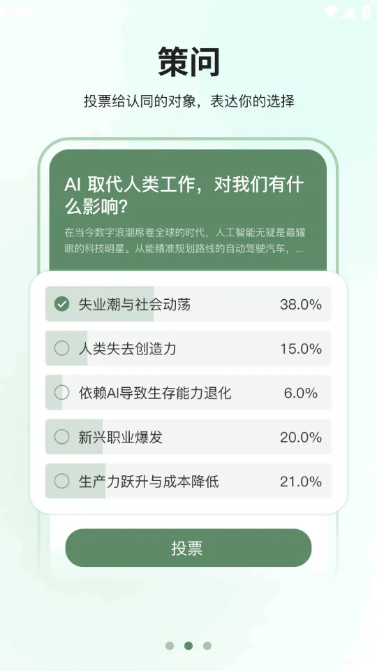 全策AI是一款决策辅助工具,提供丰富主题资源与海量精选内容。具备便捷投票、在线策评等功能,有详细策评策汇信息,动态不定时更新,支持策问投票在线策评,满足多样需求。
