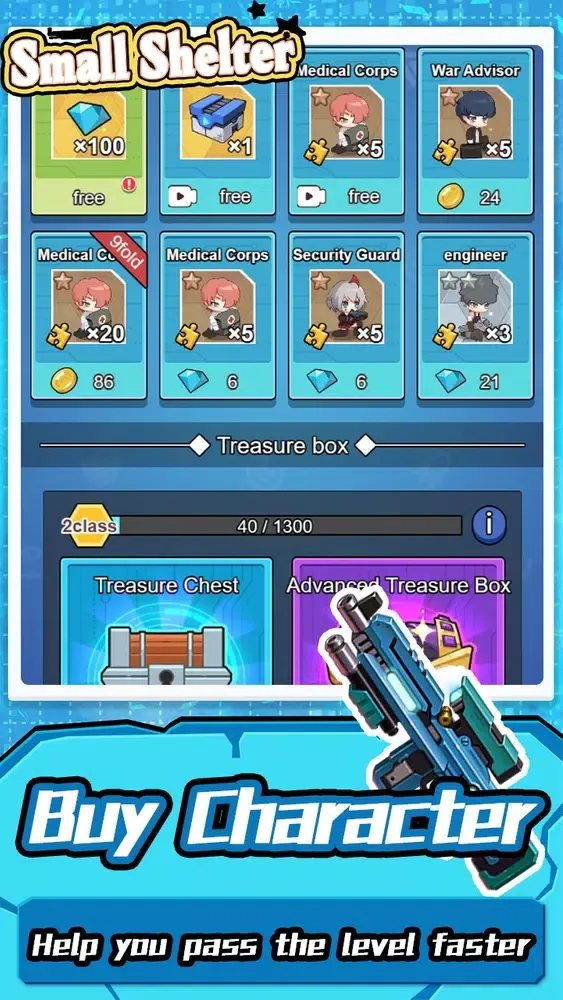 1、Q版画风融合策略塔防,超萌二次元角色手持特色武器,冲锋枪、突击步枪、扳手等各显神通。