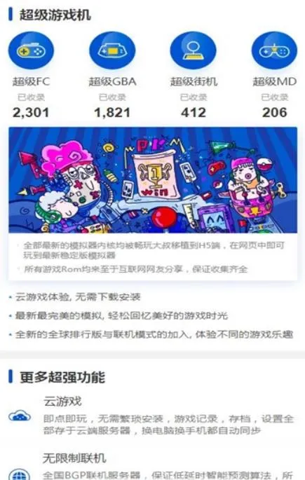 2、该平台游戏无需安装,存档等自动同步至云端。拥有无限制联机功能,采用全国BGP联机服务器,算法智能预测,手机PC端均可联机,还有全球独家GBA公网联机。