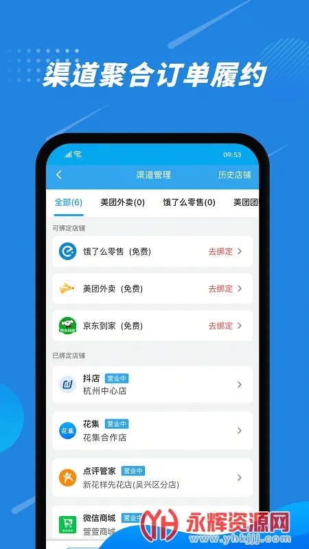 1、多平台网店即接即用,支持淘宝、天猫、京东、饿了么等主流电商渠道接入,订单数据实时自动同步,实现一站式管理多网店订单。