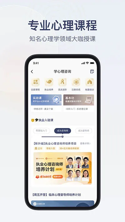 2、学习资源多样:有从入门到执业的系统化培训课程,覆盖多种心理咨询流派,且拥有500多场免费公开课、800多小时免费学习资源。