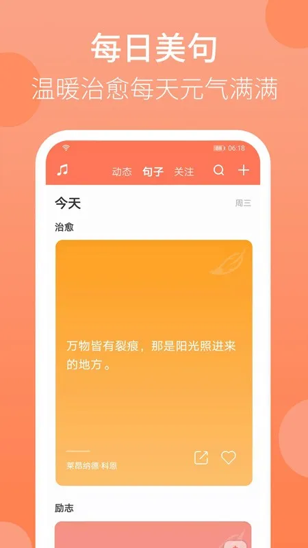 2、每日美句:每天早晨更新精心挑选的句子,治愈心灵、带来乐趣、激励人心,为新的一天注入元气。