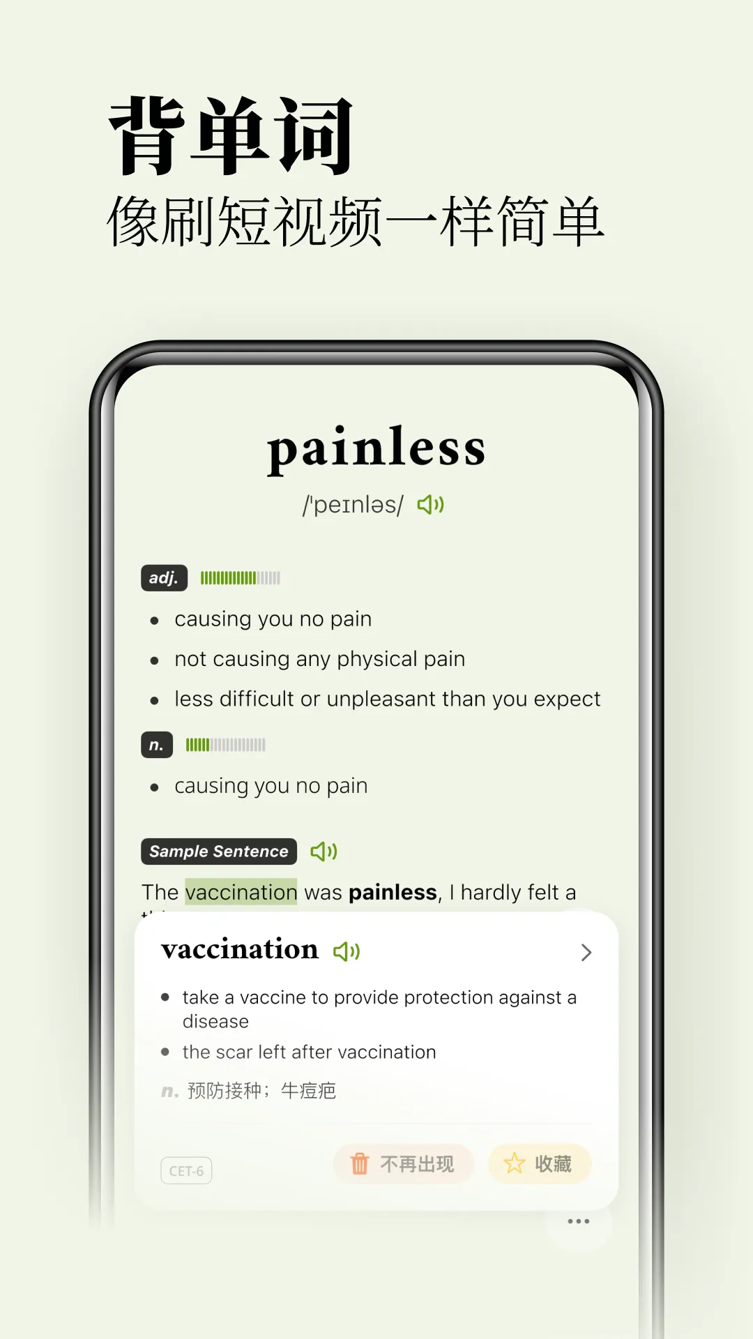 1、无痛单词有着简洁学习内容与人性化设计,能减轻记忆负担,像刷短视频般刷单词的方式很新颖,学习不再枯燥。