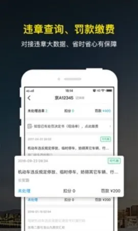 3、具备多种实用特色,如智能行车识别技术记录行车轨迹数据并打分,停车可查看周边违章贴条点,违章主动提醒避免更多违章。