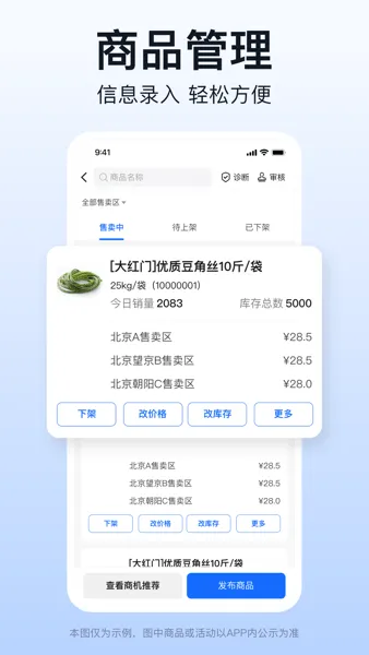 2、操作便捷,无论是商品信息录入修改、上下架,还是订单查看处理与对账,都简单高效,提升合作商日常运营效率。