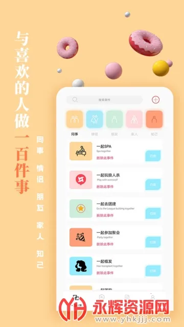 一百件事是专注关系记录的软件,供情侣、亲友等共同创建百个目标清单,涵盖多样生活体验。可打卡记录、添加纪念日与日记,数据云端存储,操作简单,提升相处仪式感与情感交流 。
