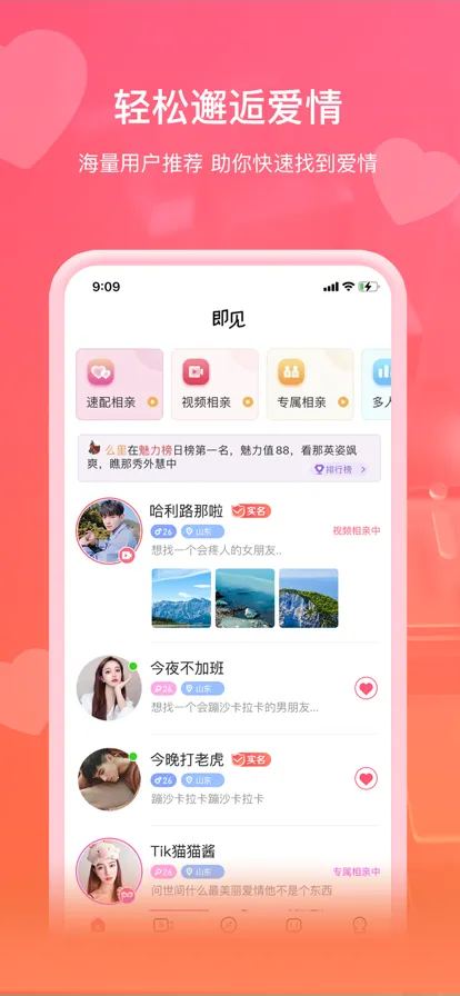 即见安卓版是专注相亲恋爱的交友软件,用户均实名认证。支持多种互动方式,有红娘牵线,能高效匹配对象。功能丰富玩法多,为单身男女提供脱单交友便利 。