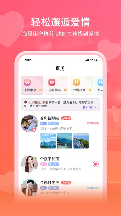 2、交友方式多样,提供视频、语音、文字等多种交友形式,支持多人视频连麦相亲、在线实时聊天互动,满足不同交友需求。