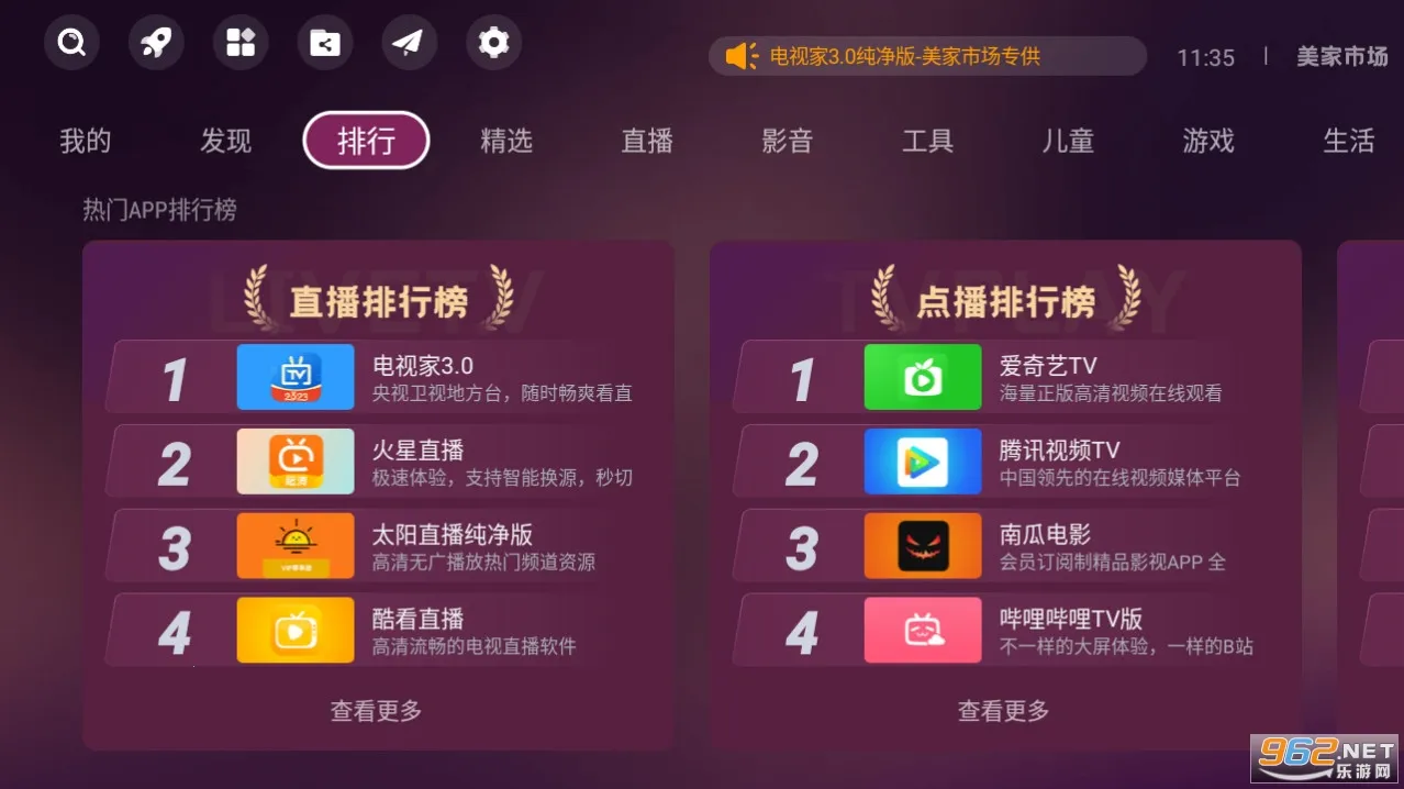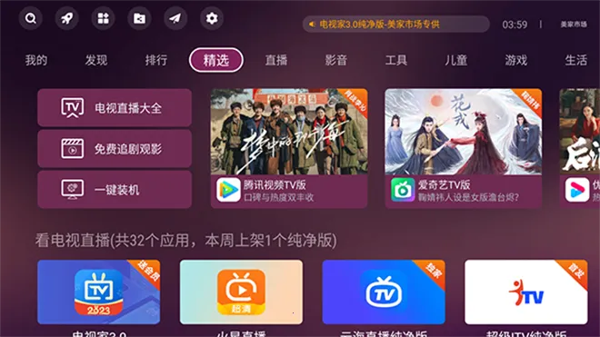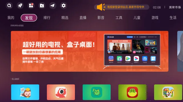 美家市场是专为智能网络电视打造的第三方应用商店。收录近千款独家电视应用,有海量影视资源,具备极速下载、完美适配等特性,涵盖多类功能,操作简单,官方原版无广告。