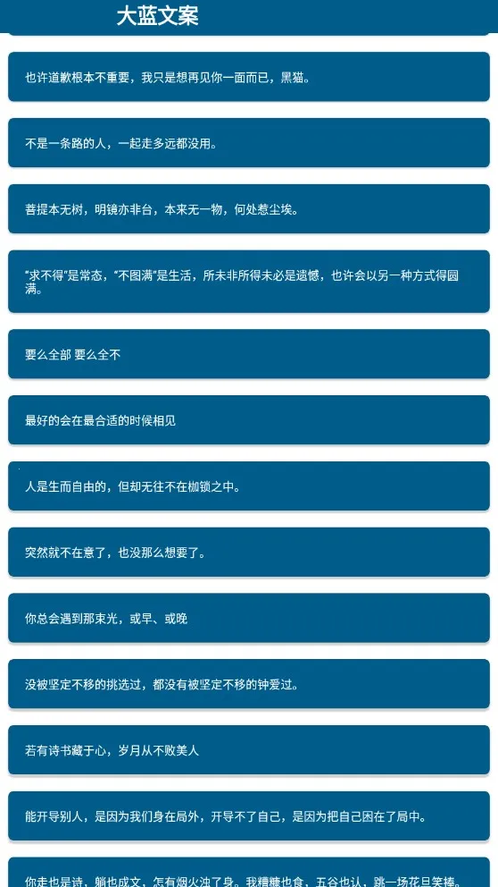 1、大蓝文案2025最新版本文案分类极为细致,无论是按传统的伤感、幽默等,还是按场景的抖音、自拍等分类,查找都很便捷。
