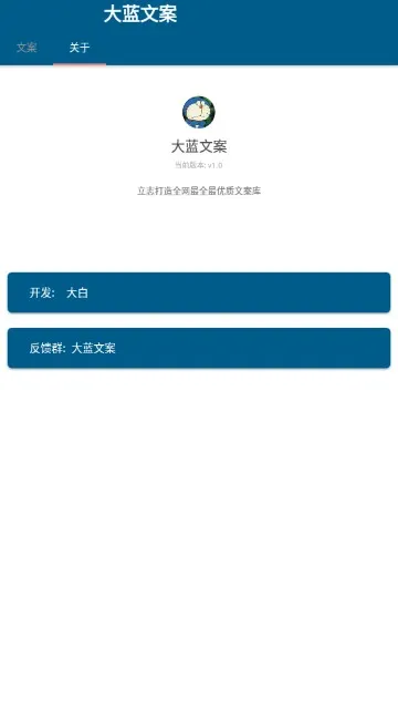 大蓝文案 2025 最新版本是娱乐文案软件,有海量新颖文案,提供灵感。百万条文案免费、分类细致,搜索强大,支持一键复制,还有多种特色功能,满足文案需求。