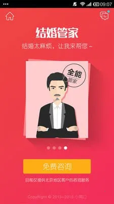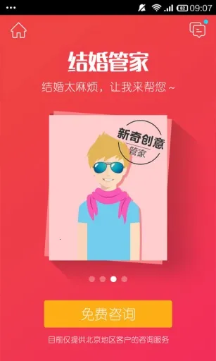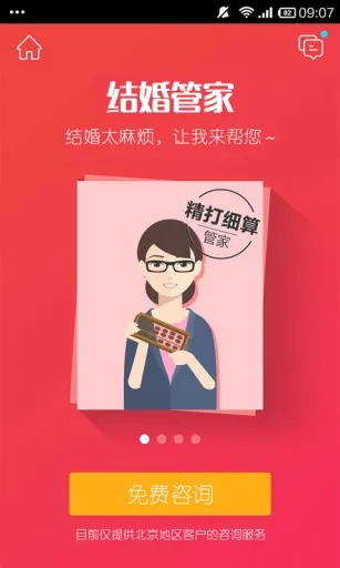 结婚管家安卓版,由小两口婚博网提供服务。有资深专家 1 对 1 解答筹婚难题,涵盖多方面。有上千家商家资源,提供时尚定制、新奇创意等服务,目前仅北京地区可咨询 。