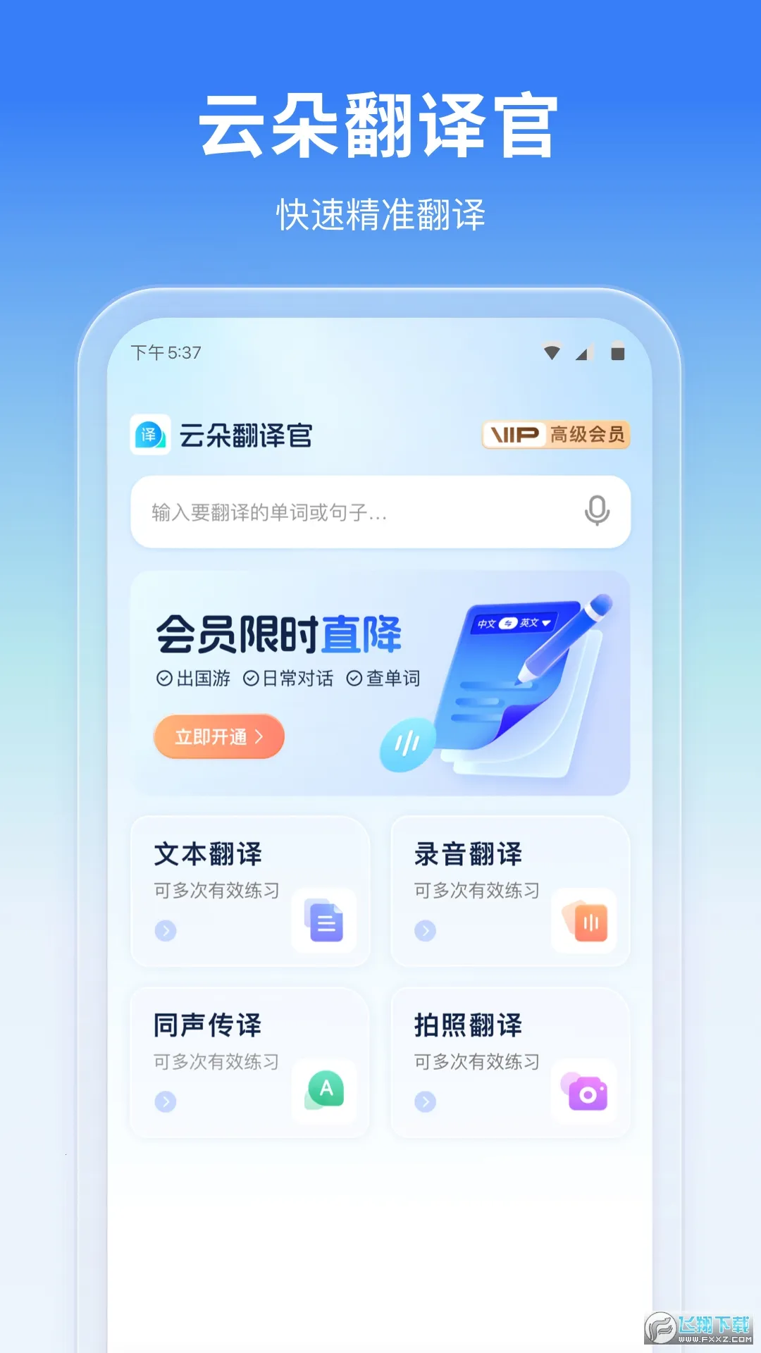 云朵翻译官是一款高效准确的翻译工具,支持实时翻译,具备多种翻译模式,如录音、拍照等。操作简单,适用场景广,结合先进技术与庞大数据库,快速准确满足多样翻译需求 。