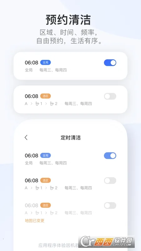 2、个性化定制功能实用:该软件支持多种个性化设置。能构建户型地图,用户可个性化命名划分地图、设置房间与区域;还能框选指定区域进行划区清洁,设置虚拟墙与禁区避免机器人进入特定区域,也可根据生活习惯预约清扫。