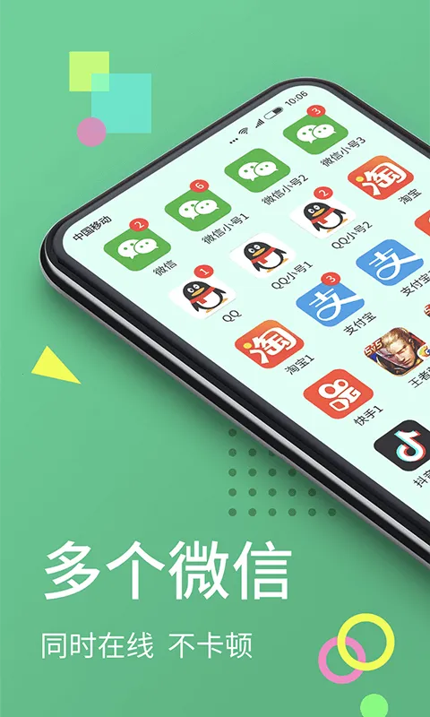 4、应用多开广泛:不单支持微信双开,其他如QQ、支付宝、淘宝、抖音、拼多多等应用和游戏均能双开,还支持企业微信,满足不同用户的多样化需求。