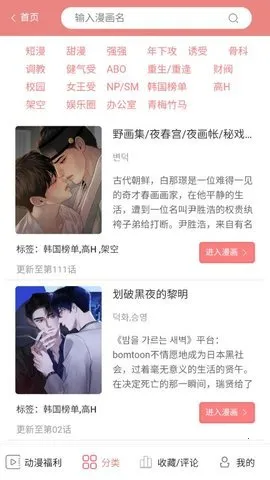 2、分类与搜索便捷:提供漫画分类功能,将漫画分为恋爱、都市、历史穿越、修仙、日常、耽美等不同类型;还提供智能搜索工具,支持关键词、作者、标签等搜索方式,能在3秒内准确定位目标作品。