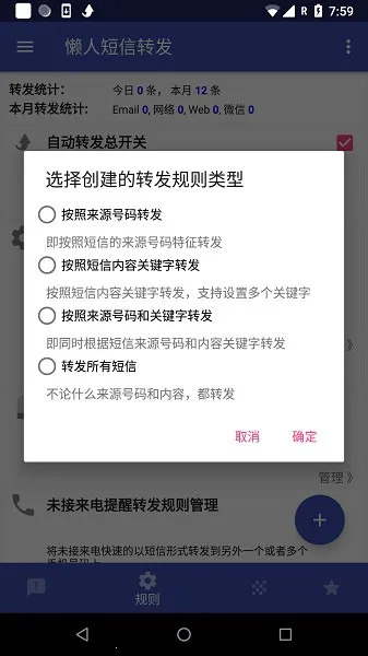 2、转发功能强大,作为专业的自动转发短信应用,支持多达6种转发方式,可设置转发规则的时间范围、邮件地址、排除的关键字或号码等,还能不花短信费转发短信。