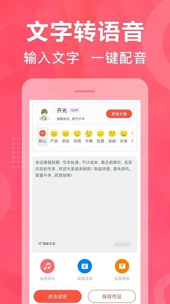 2、软件支持语速调节、停顿调节和背景音乐设置,用户可以自由调整配音效果,打造更精彩的音频作品。