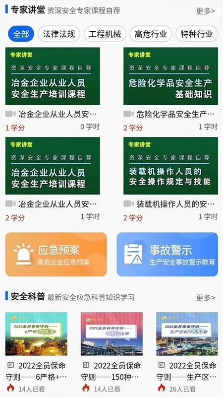 1、课程丰富多样:涵盖继续教育、工程机械、法律法规等课程,涉及非煤矿山、煤矿、建筑施工、交通运输、工程机械等高危行业,能满足不同用户对安全知识学习的需求。