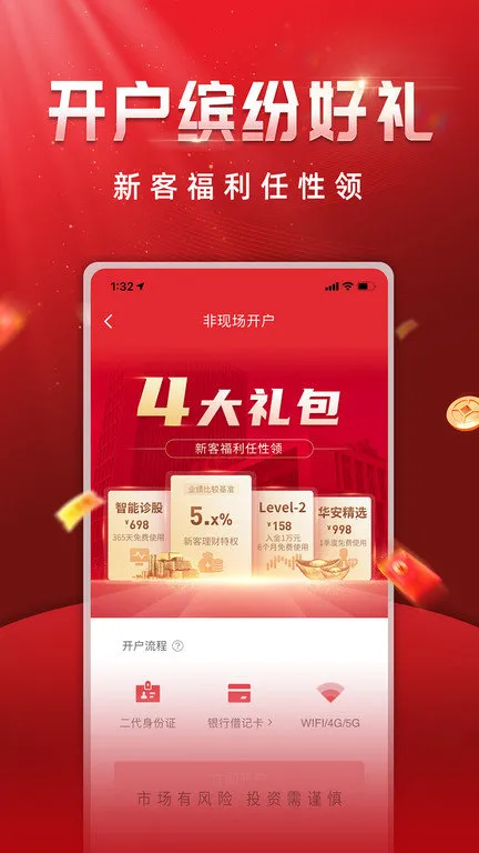 1、新手福利丰富:为新客提供专享礼包,可任性领取,包含Level - 2十档行情、新手理财、智能诊股、华安精选投顾服务等。