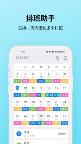 3、查看方便:以日历视图形式展示排班信息,有清晰的颜色标签排列,让人一目了然。还支持桌面小组件,能快速查看排班,也可直观方便地查看某一天的排班信息。