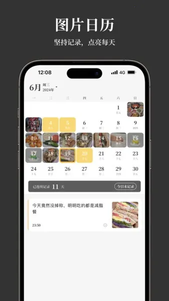 3、打卡助养成:日历视图可自动对每日记录内容打卡,方便用户第一时间查看,有助于养成良好记录习惯,告别拖延症。