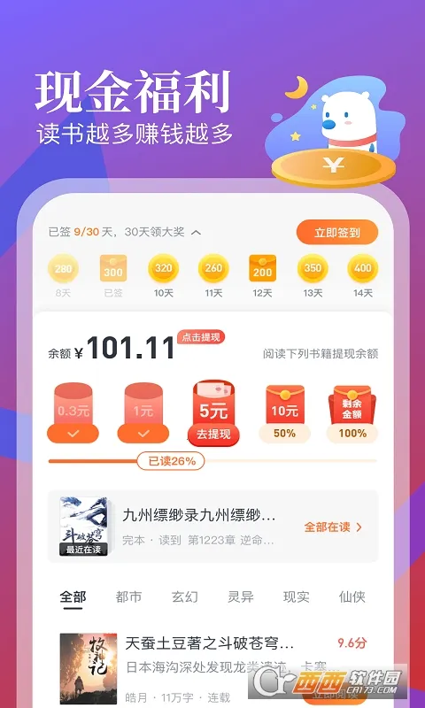 2、福利多样:有阅读浏览、邀请、签到、晒图等每日任务,可轻松赚取零钱,随时提现,支付宝急速到账;还有全天拆红包领金币等各类金币活动;新书热书天天有限免,读书还能得红包;参与现金书单活动,完成任务可领取100元现金红包及千元好礼。
