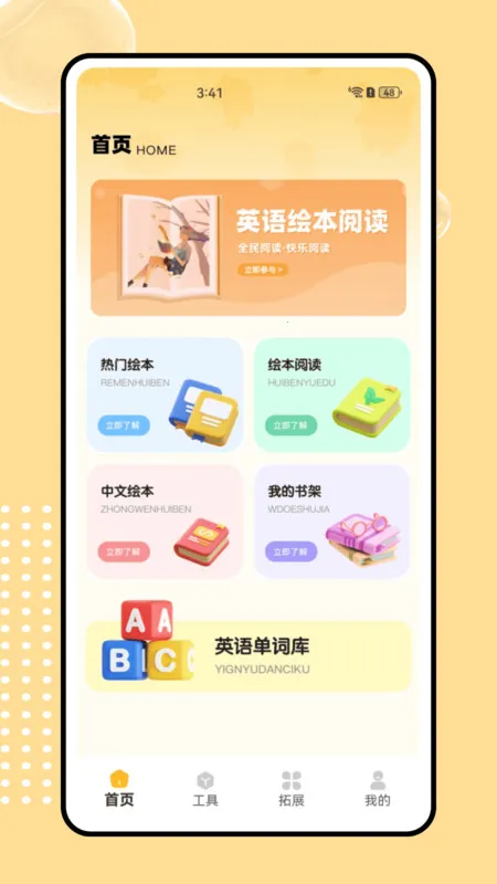 sss儿歌(英语学习宝)是助力儿童学英语的软件。它汇集全面知识点,有热门绘本、英语单词库等资源。工具页实用,拓展页引入新概念英语,结合儿歌绘本,让学习趣味又系统。