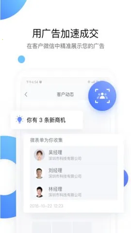3、商机管理很强大:各渠道来源的商机可统一导入客户库,借助智能管理系统构建详细客户资料与画像,实现统一与精细化管理运营。还能通过智能名片等小程序营销工具对商机进行互动营销,推进客户关系。