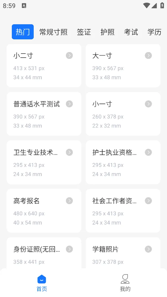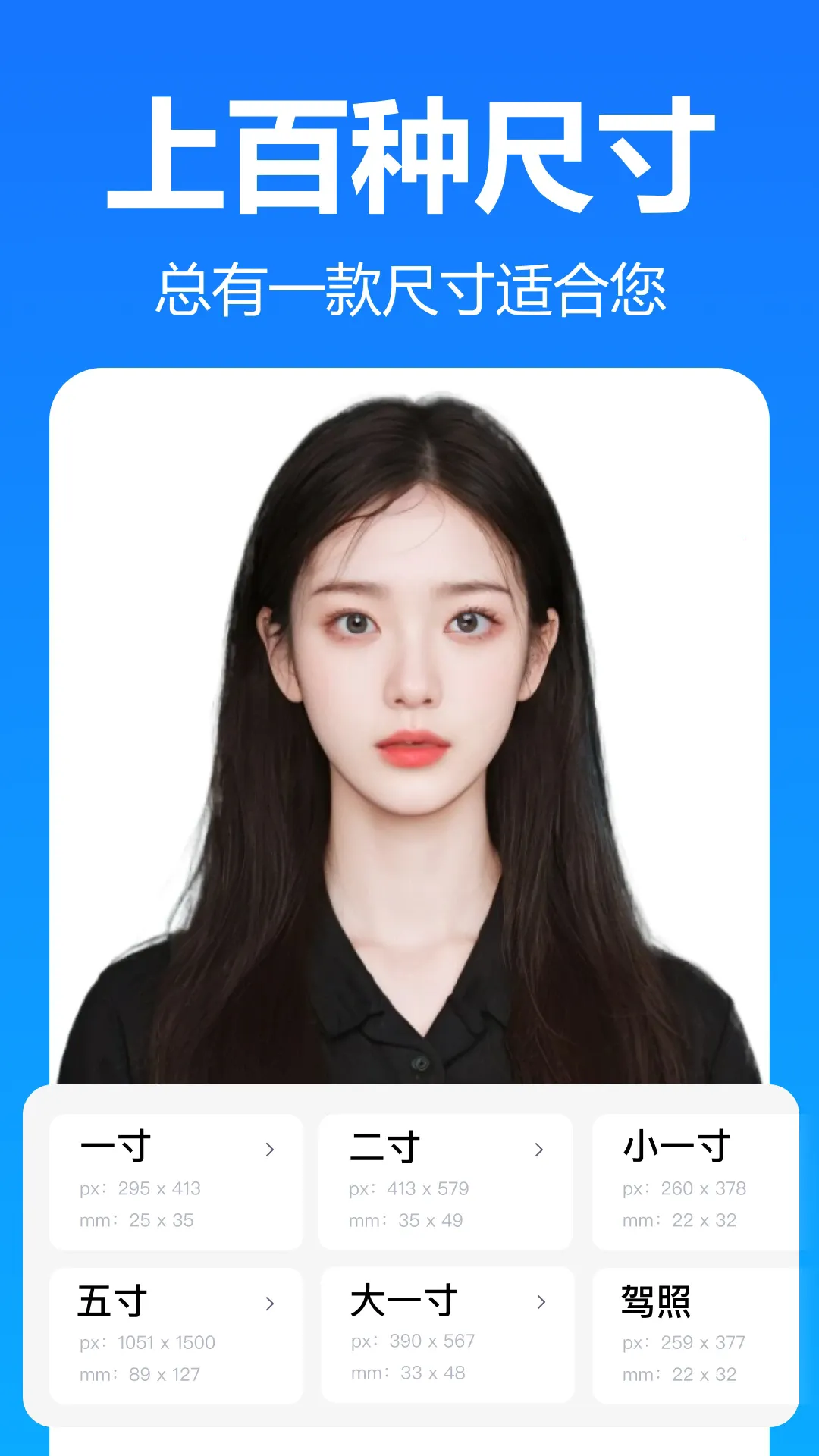 3、尺寸广泛:支持上百种证件照尺寸规格,涵盖国内各类考试、证件办理及国际签证等场景的尺寸要求,用户无需自行换算尺寸。