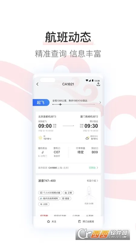 3. 航班动态实时查看,起降时间、登机口信息、行李提取地点及天气提醒等一目了然。