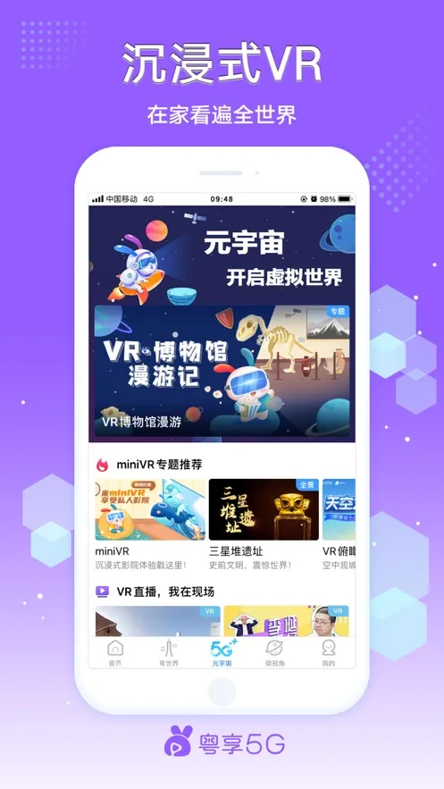 粤享5G是广东移动打造的综合互动视频平台,超实用!它能满足你多样的娱乐需求。这里汇聚海量优质影视资源,电影、电视剧、综艺等应有尽有,播放清晰流畅,在家就能享受大屏观影追剧的快乐。还有超高清全景VR环绕,足不出户体验沉浸式场景。全新游戏栏目超赞,200多款爆款热游无需下载即点即玩。它还支持查找附近5G网点,办理移动在线5G特色业务,设置热门超高清视频彩铃等。不仅如此,新人下载注册就领10G流量,还有丰富活动和会员福利。有了粤享5G,打破传统观看模式,随时随地享受精彩,无论是娱乐消遣还是体验5G特色服务,它都能轻松搞定,赶紧下载试试吧!