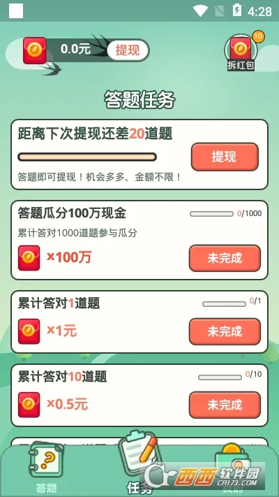 想知道玩“一起来答题”能不能赚到钱?那你可来对啦!这是一款超有趣的益智答题闯关软件,能让你边玩边学还能赚钱。它精选海量百科知识,题目种类丰富,有成语填字、找茬、看图猜词等。你能从底层一步步升官发财,兑换红包。和好友一起比赛,看看谁知识储备多。答对题目不仅能解锁成就,荣誉满满,还能学到天文、地理等各方面知识。操作简单,手指点选项就行。限时模式很刺激,在规定时间内答对更多题。软件有浓厚古代传统学堂画风,还有Q萌音效,让你沉浸其中。只要答题够多,积攒金币就能换红包,实现边玩边学边赚,轻松打发休闲时间,不管你知识水平如何,都能在这找到乐趣,快来下载体验吧!