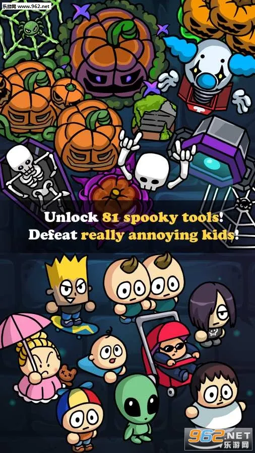 1. **玩法体验**:玩家扮演鬼屋主人,放置南瓜灯、幽灵、骷髅等道具吓跑来捣乱的孩子,避免他们闯入。这种独特的塔防玩法,与万圣节主题巧妙结合,轻松有趣。