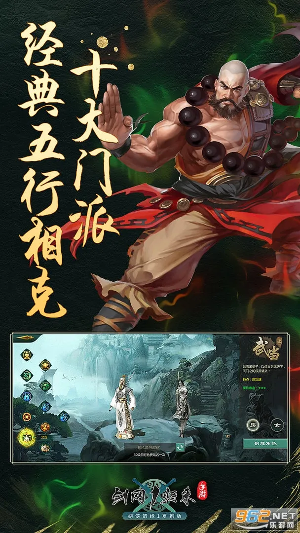 3. 门派多样且经典五行相克,天王、武当等十大门派分金木水火土派系,相生相克维持平衡。
