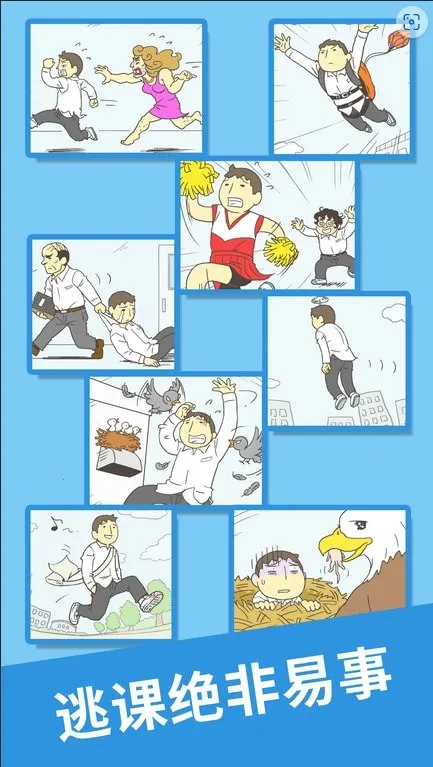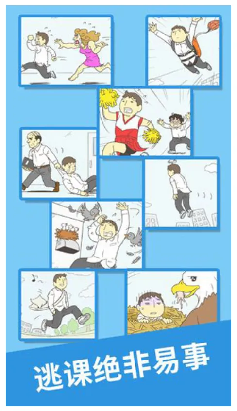 - **轻松上手的体验**:操作十分简单,单手即可玩转。玩家扮演学生,利用关卡提供的道具顺利翘课就行。画面设计简洁,采用卡通风格画风立绘,搭配56个独立关卡模式,供玩家任意挑战。