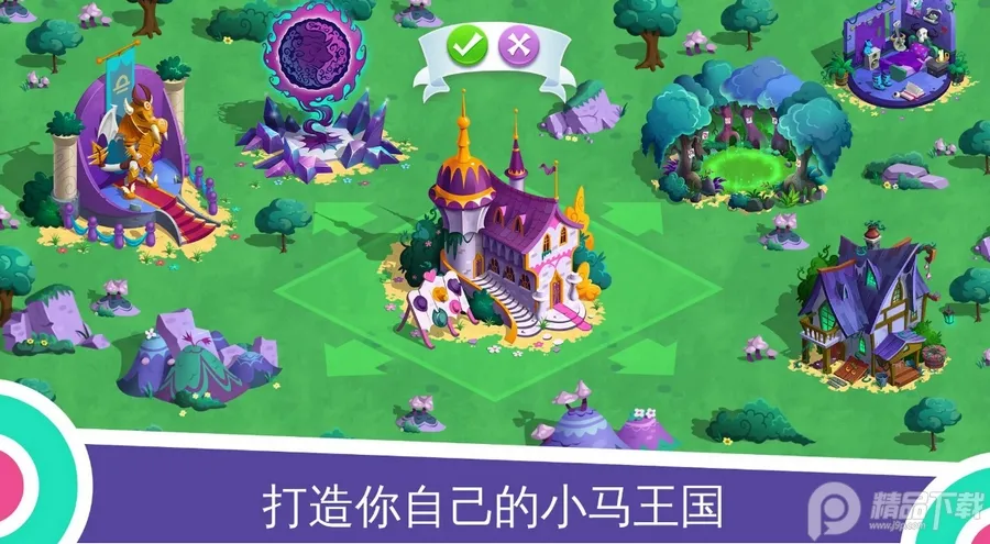 2. 游戏中可亲手规划建设专属小镇,建造多样设施吸引更多小马居民。完成任务能获金币与魔法石,用于扩展城镇规模、解锁精美建筑,让小镇日益繁荣。