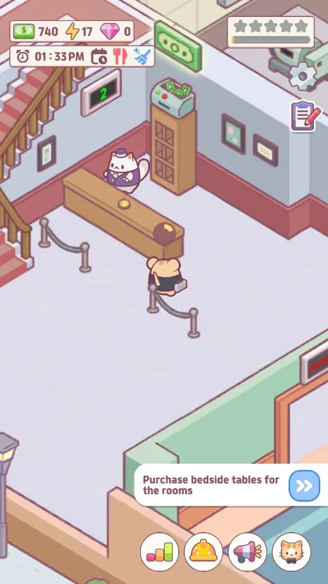 2. 从零开始建造:目标是帮助创业猫从零开始建造并管理一家令老鼠世界羡慕的酒店,通过创建五星级酒店,升级房间、提供一流服务,给予老鼠客人皇家待遇。