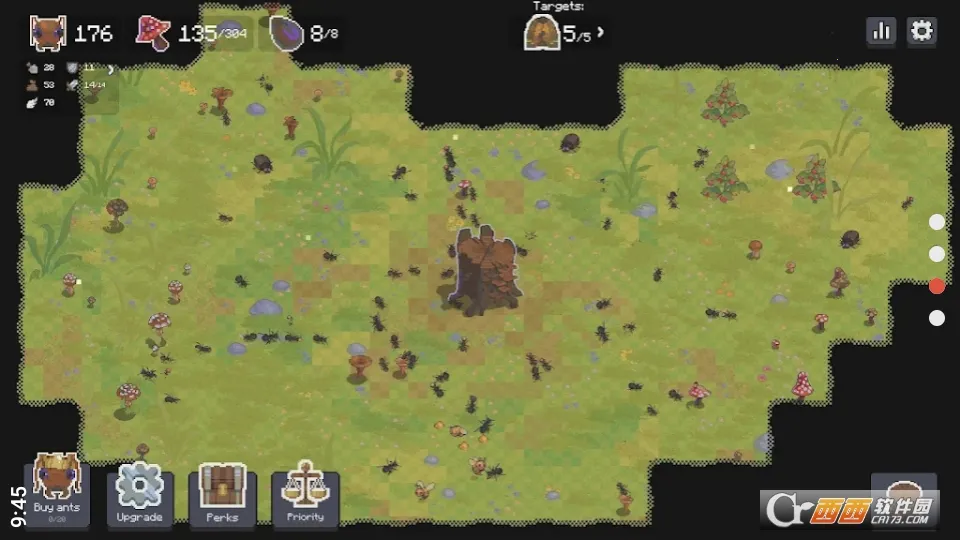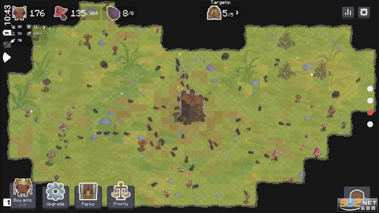2. 操作简单易上手,点击相应按钮就能购买蚂蚁、扩建蚁穴等,左上角显示蚂蚁人口和食物,右下角树桩可进蚁穴。