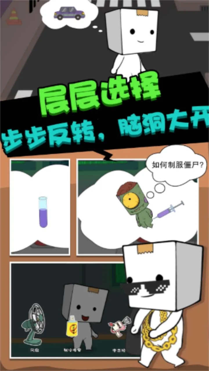 2. 游戏玩法丰富,融合多种元素,体验趣味十足。纸盒人面临状况时有多种选项,每个选择都影响故事走向,需深入思考决定带来的连锁效应,运用智慧策略帮其摆脱僵尸追击。