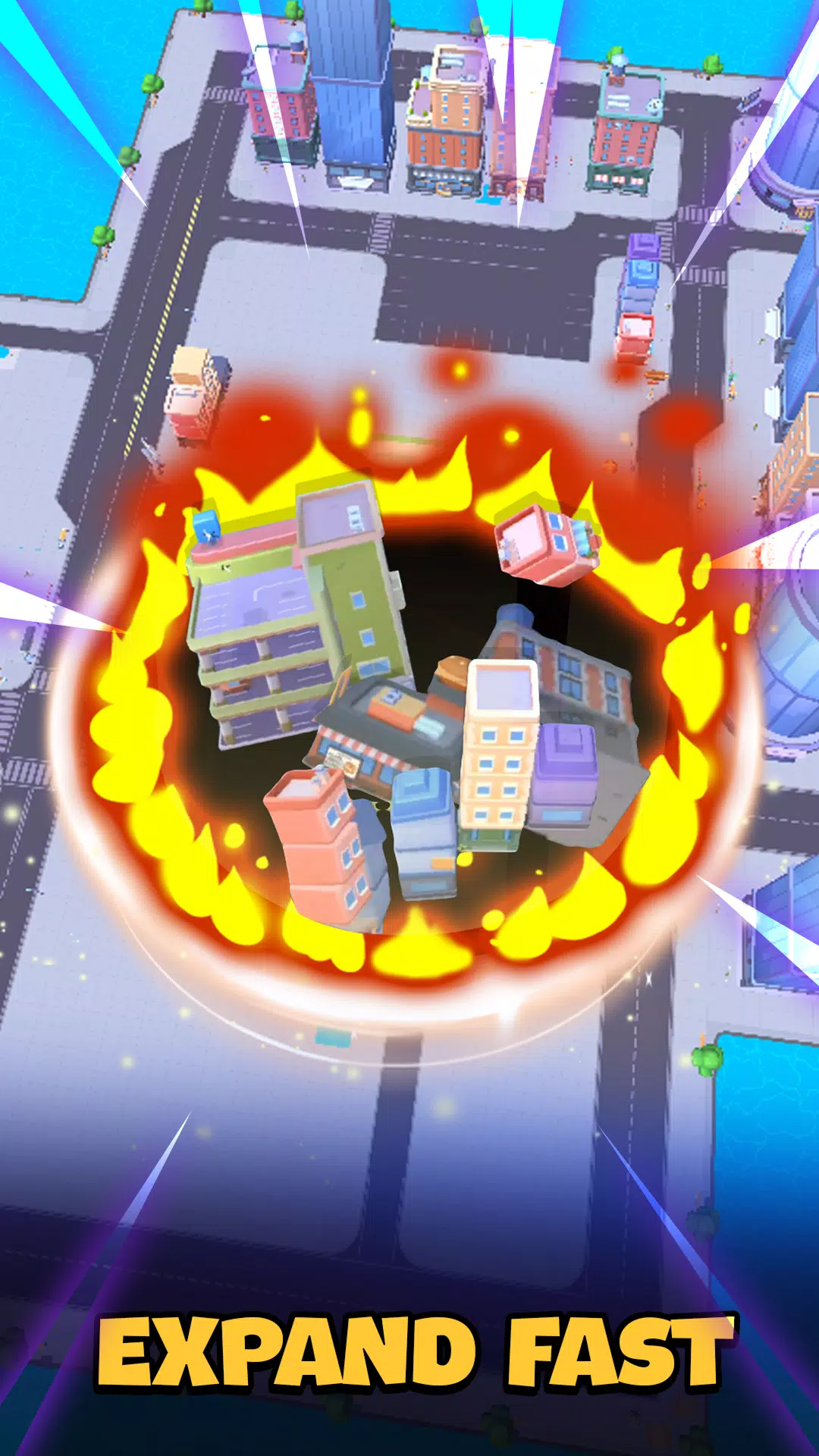 1. 控制神秘黑洞在地图上滑动,收集汽车、树木和建筑,通过吞噬洞穴不断壮大,装满后还能产下蛋孵化恐龙。