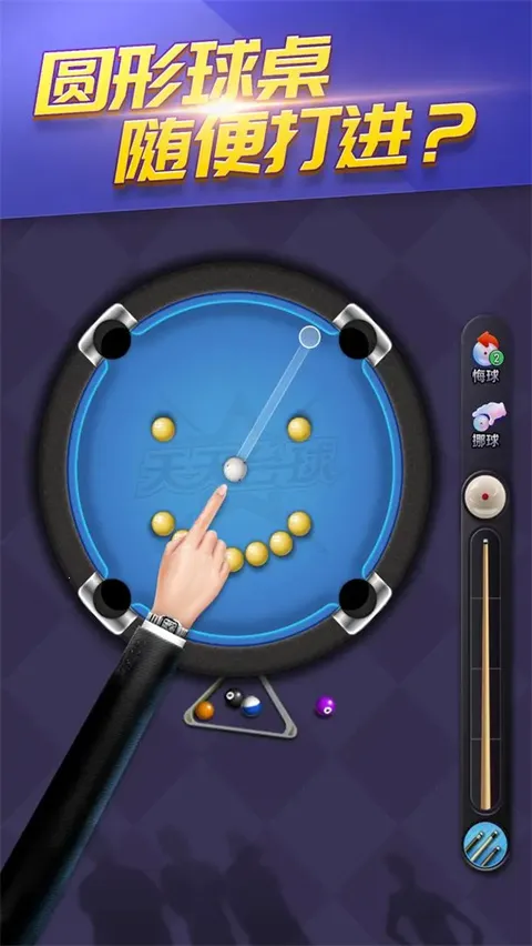 3. **简便操作方式**:操作简便,设有多个虚拟按钮,玩家通过控制标尺左右移动调整球杆角度,点击屏幕发力击球,利用右侧力度条调节击球力度,在手机上也能轻松掌控台球。