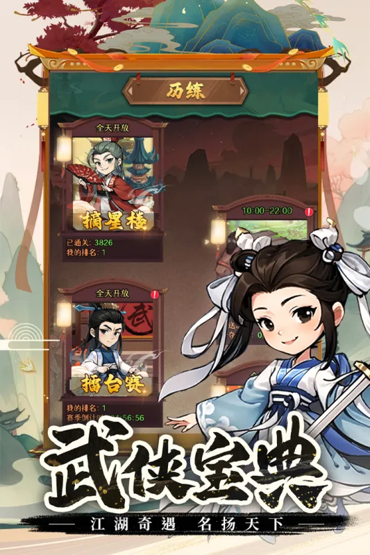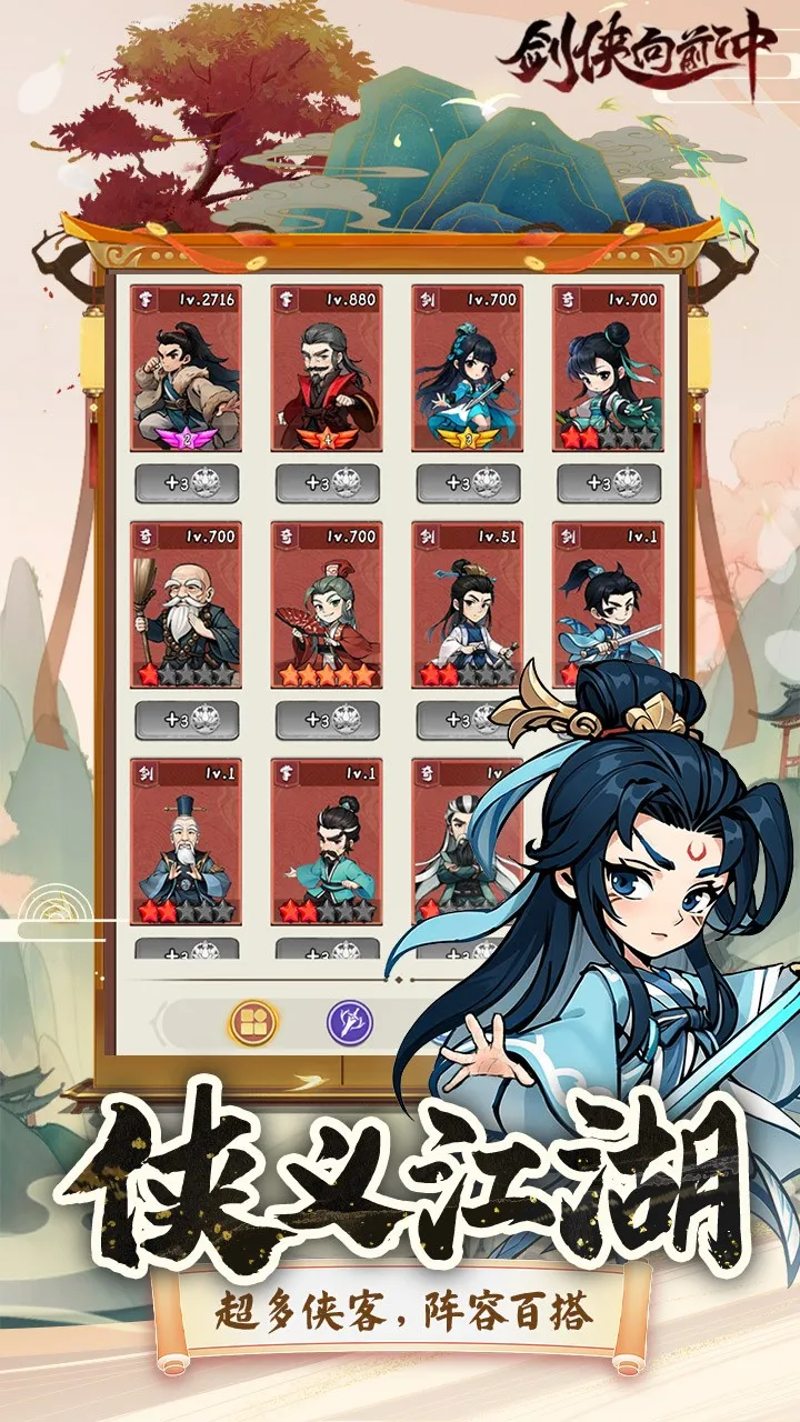 3. **深度养成系统**:侠客可升级,等级与主角同步,越高战力越强。通过闯关活动获取宝箱,有几率开出侠客,宝箱阶级越高开出品质越高。侠客还有专属装备可升级进阶。