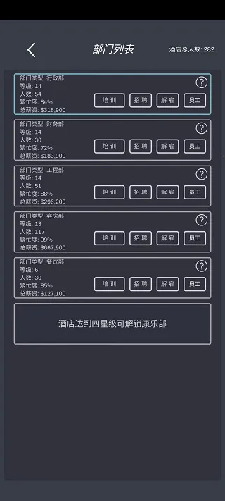 1. 玩家在游戏中化身酒店老板,从招募员工到制定制度,再到策划营销等事无巨细都要操心,能充分体验经营酒店的全过程。