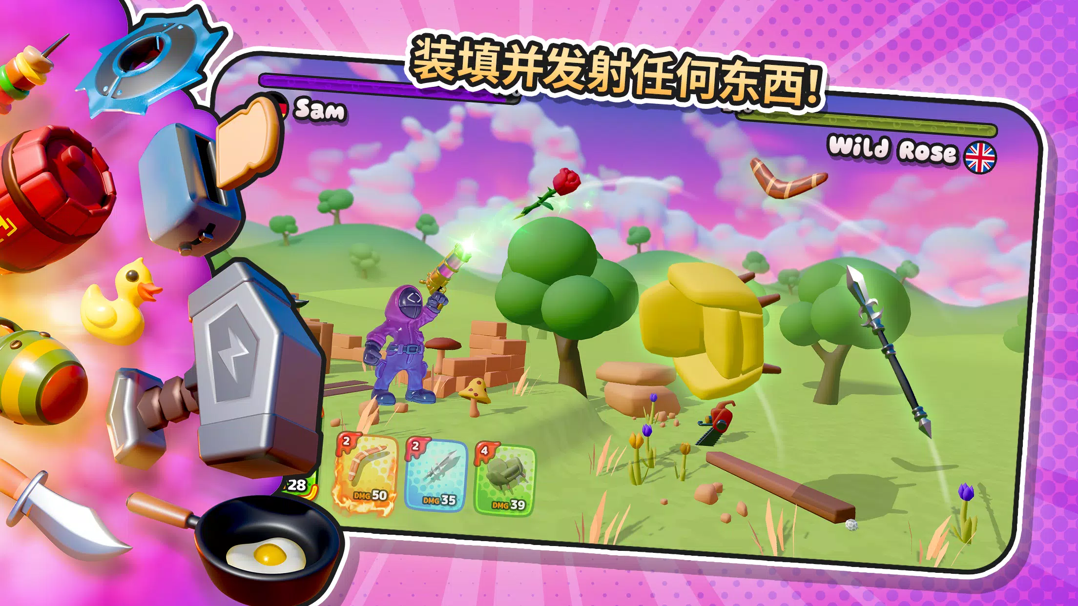 1. 这里有独特的决斗方式,用各种奇特武器战斗,比如发射橡胶鸭子、用婴儿核弹摧毁对手,挑战对武器的想象力。