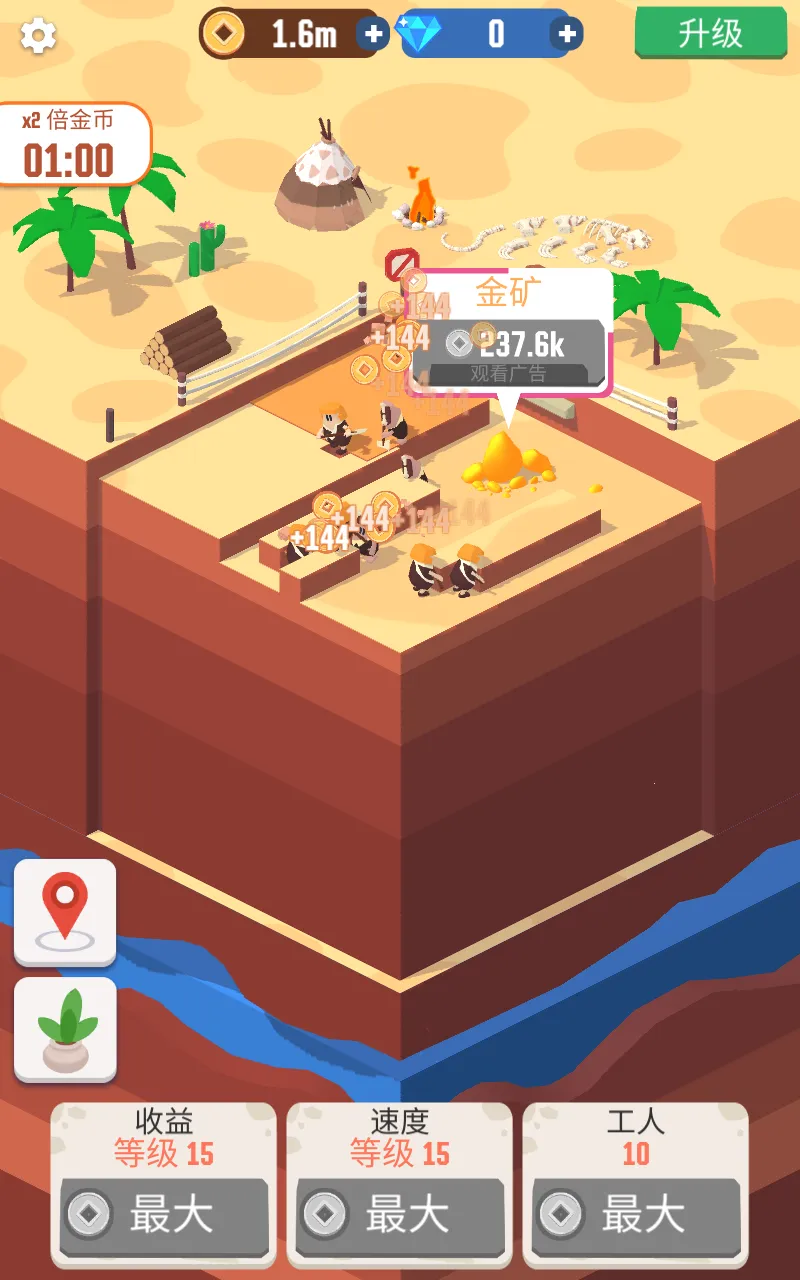 1. 游戏采用轻松休闲的放置玩法,画面简洁但玩法丰富,指尖点击操作就能提升工人挖矿效率,获取更多财富,还能自由建造各种建筑,带来诸多乐趣。